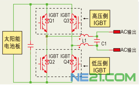 目前,太阳能逆变器已有多种拓扑结构,最常见的是用于单相的半桥、全桥和Heric(Sunways专利)逆变器,以及用于三相的六脉冲桥和中点钳位(NPC)逆变器。太阳能逆变器的典型架构一般采用四个开关的全桥拓扑,如图1所示。