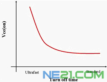 以图2为例,若IGBT拥有相同的体积和技术,一个超速IGBT比一个标准速度的IGBT拥有更高的Vce(on)。然而,超速IGBT的关闭速度却比标准IGBT快得多。图2反映的这种关系,是通过控制IGBT的少数载体复合率的使用周期以影响关闭时间来实现的。
