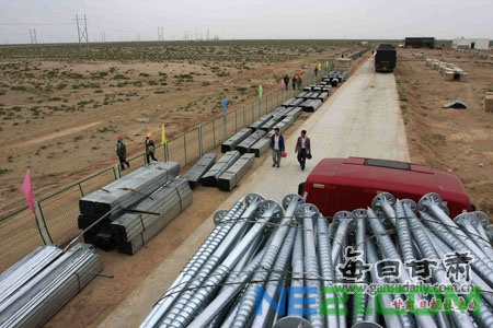 9月2日,工人们从准备安装的太阳能设备旁走过。由中国华电集团新能源发展有限公司投资兴建的民勤红沙岗10兆瓦光伏发电项目,是民勤县第一个上规模的清洁能源开发利用项目。项目总投资2.32亿元,设计安装20台低倍聚光光伏发电阵列,建设装机容量10兆瓦并网光伏电站,年均发电量205万千瓦时。(姜爱平 摄)