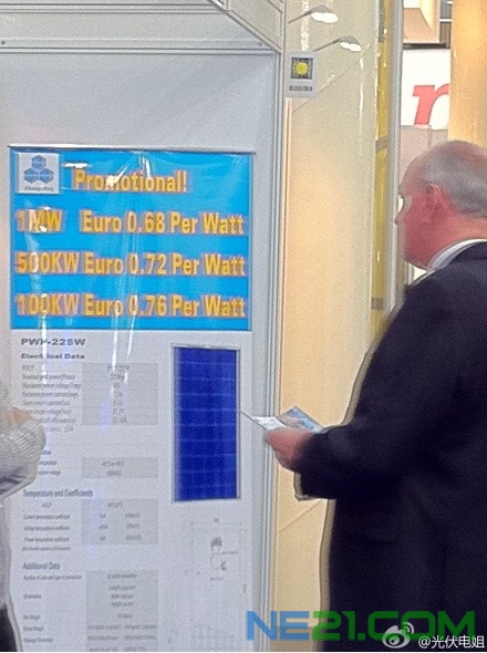 今日,在EU PVSEC展览期间,官方广播报道,中国浙江某光伏企业以超低0.64欧元/W的组件价格来吸引订单,引起业内嘘声一片。同时,今日有业内人士在微博爆料,某企业以0.68元/W价格抛售电池板,使得卖组件变成了“卖白菜”,但这样的报价其实并不能换来市场的同情和认可,一味的低价、一味的降价,是对整个中国光伏产业的亵渎。使我们刚刚建立起来的整体信用受损,此刻,市场低迷、产能过剩!正值中国光伏产业紧要关头,需要企业抱团取暖的时候,跳出一个搅浑水的企业,使得原本就弱不惊风的市场再度笼罩在降价风暴中。让中国企业丧失与欧洲客户议价的平衡筹码。