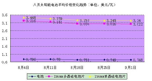 硅片价格的走低自然会带动晶硅电池片和太阳能电池的价格,硅片价格本月的下跌幅度虽不明显,但基本上已经及时的反应在下游晶硅电池片和太阳能电池上。8月初太阳能电池平均价格为0.796美元/瓦,截至9月1日,其平均价格为0.748美元/瓦,环比下跌6.03%。此外,156单晶硅电池片价格由3.448美元/瓦跌至3.24美元/瓦,环比下跌6.03%。156多晶硅电池片价格由3.216美元/瓦跌至3.022美元/瓦,环比下跌6.03%。