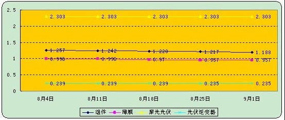 光伏产品价格都经历了一轮深跌,普遍反应短期内价格难以有大起色。组件价格经过前期深跌后,近段时间组件价格始终维持在约为2.303美元/瓦,而在之前二季度整个光伏市场的大跌时,组件价格也始终保持在2.303美元/瓦,其原因是,其价格已经基本接近成本价。由于欧洲也很清楚中国目前产能过剩的困境,全球产能达到50GW而产量需求为25-30GW,大部分业内人士认为组件价格难以明显回升。