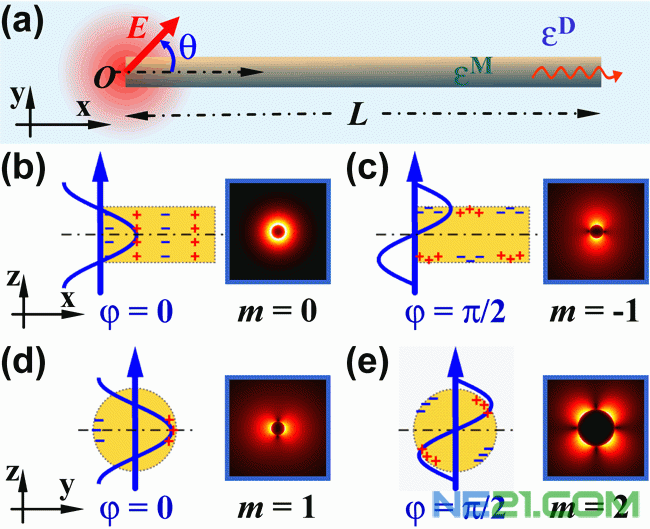 | 图1 (a) 局域光激发金属纳米线示意图;(b-e) 左:垂直或平行偏振激发下纳米线中的不同的模式以及它们的相位。右:被激发模式的电场分布。 |