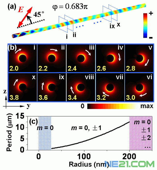 | 图2金属纳米线上的手性表面等离激元。(a) 表面电荷分布;(b) 不同横截面上光能流分布;(c) 螺旋的周期随纳米线半径的变化规律。 |