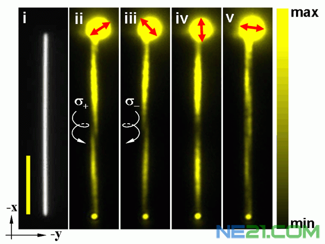 最近,徐红星研究组的博士生张顺平和魏红博士等通过理论和实验相结合的研究发现了在均匀的介质环境中,不同模式的金属纳米线表面等离激元的相干叠加可以产生手性(左旋或右旋)的表面等离激元,使光场能量绕着纳米线螺旋地向前传播。与圆偏振光的产生原理类似,手性表面等离激元也是由两个具有固定 π/2相位差且相互正交的分量(一阶模)叠加而成。通过改变入射光的偏振与纳米线的夹角,可以控制表面等离激元的手性(左旋或右旋)。而螺旋的周期也可以通过纳米线的大小、周围介质的折射率、激发光波长等参数来控制。这些性质对于亚波长光学器件与回路的设计与制作具有重要意义。利用量子点近场成像技术,可以精确的观察到等离激元的不同的手性传播特性。手性电磁波的一个重要应用是与手性物质相互作用。从纳米线末端发射出来的光子将保持表面等离激元的手性,因此,金属纳米线手性表面等离激元可用于设计宽带可调的纳米圆偏振光光源,即纳米尺度的1/4波片,可用于在纳米尺度上探测光与手性物质(如单个手性分子、单个DNA和蛋白分子的手性部分等)之间的相互作用。相关工作发表在近期的Phys. Rev. Lett., 107, 096801 (2011)上。