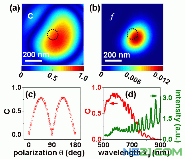 | 图4 纳米线出射光保持了表面等离激元的手性。(a) 出射光的圆偏振度;(b) 圆偏振品质;(c) 圆偏振度对激发光偏振的依赖关系;(d) 圆偏振度(红线)与透过光强(绿线)随入射光波长的变化关系。 |