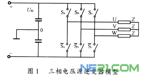 电压源逆变器可由图1所示的6个开关来等效表示。逆变器桥臂的上下开关在任一时刻不能同时导通。不考虑死区时,上下桥臂的开关呈互补状态,因此逆变器有8种不同的开关模式。