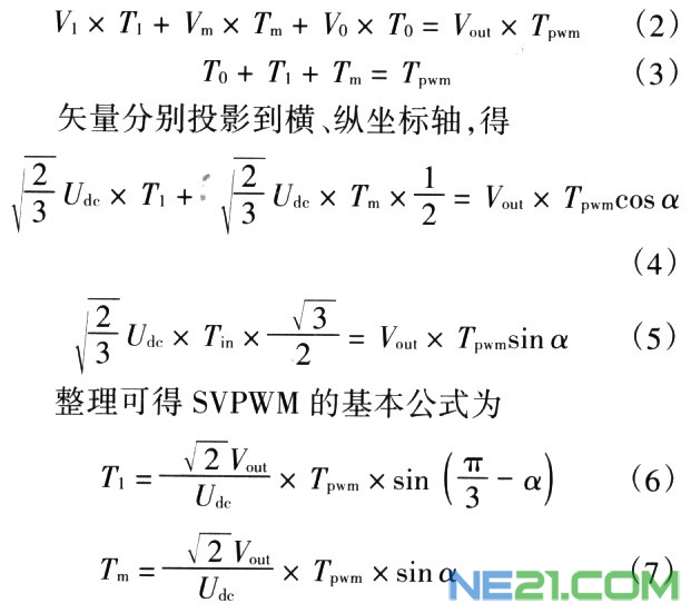 通过不同的矢量组合可以合成新矢量,如图2所示,设相邻两个有效矢量V1和Vm,零矢量为Vo,合成新矢量Vout,矢量作用时间分别是T1、Tm、To。Tpwm是PWM脉宽周期。