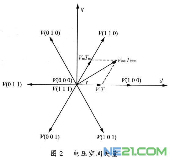 逆变器的8种开关模式对应有8个电压空间矢量。采用3/2坐标变换,将三相电压变换到d—q轴系。