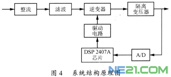 通过比较各种功率变换电路,例如方波逆变器、阶梯波合成逆变器、正弦脉宽调制逆变器等的优缺点,确定仍沿用产品初样阶段使用的全桥逆变式结构方案,重点在改进控制方式上,即在控制方式上采用全数字的控制方式,采用空间矢量正弦波脉宽调制(SVPWM)式的控制方式。系统结构原理图如图4所示。
