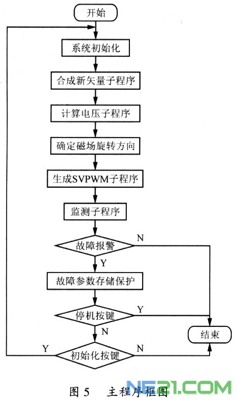 由于采用TMS320LF2407A,使编程的工作量大为减少。采用汇编语言编程,指挥整个系统的工作,通过系统初始化子程序对各参数、寄存器等进行设定,实施对主电路的控制,逆变输出50Hz的三相交流电。编程采用顺序结构,调用子程序简单方便,子程序可以把电压、电流、频率的数值通过LED分别显示出来。在整个工作过程中,随时对电流、电压进行测量比较,一旦出现过流、欠电压情况及时报警,情况严重时自动停机,并且存储故障参数。主程序流程框图如图5所示。
