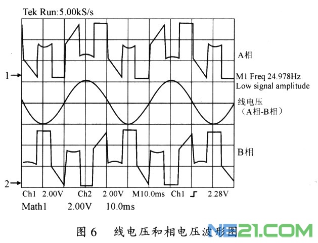 根据生成SVPWM的基本公式式(6)~式(7),只要给定输出频率、输出线电压、直流母线电压,经过SVPWM子程序和TMS320LF24007A SVPWM状态机,生成PWM脉冲控制(图1所示的)三相逆变桥,将会在逆变桥的输出端得到三相对称的正弦电压波形(滤波后)。