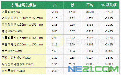 原料的部分,根据EnergyTrend的分析,下游厂商的需求并未成长,但上游多晶厂出货的动作并未停止,使得下游硅外延片与电池厂商目前面临极大的库存压力。而为了降低损失,买卖双方持续针对价格与供货进行交涉,而有些厂商更是断尾求生,直接终止合约的履行以降低库存的压力;而大部分的厂商均将多餘的库存在现货市场上进行抛售,使得多晶硅价格持续走跌。虽然上游多晶硅厂拥有长约保护,短时间内仍可享受较佳的售价与利润,不过一旦价格差距过大,将促成更多厂商针对长约内容进行调整,终将对多晶硅厂商产生不利的影响。根据调查,本週多晶硅的现货价格已逼近$40/kg的关卡,目前平均价格来到$48.61/kg,跌幅为1.56%。