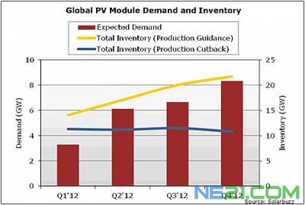 Solarbuzz还指出,组件供应商若想将库存天数保持在2011年年底的水平,预计明年的产能将削减约11GW。否则,2012年底的组件库存量将达到22GW。