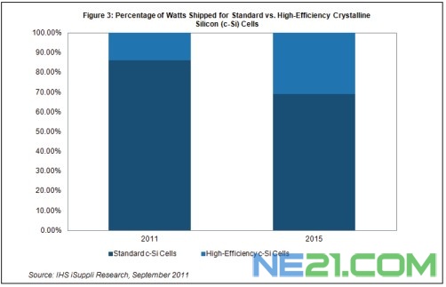所谓的高效率太阳能电池2011年仅占总体c-Si电池市场的14%。在太阳能板中,c-Si电池负责把太阳能转变成电能。采用较旧技术的标准效率太阳能电池占86%。