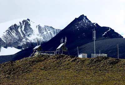 这是在西藏当雄县境内念青唐古拉雪山脚下安装的光伏发电设施