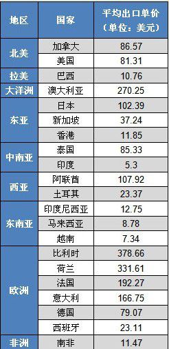 与亚洲地区低价相反,除西班牙外,欧洲地区维持较高价格水平。这是因为,第一,中国出口产品在欧洲地区容易遭遇反倾销;第二,欧洲消费者对价格的敏感度更低,他们更重视产品的质量;最后,中国进入欧盟的关税和壁垒较高,厂商必须对出口欧盟国家的产品进行技术研发,这会增加产品成本。与欧洲类似,大洋洲维持较高的价格水平。