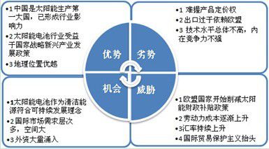 尽管我国太阳能电池出口呈现逐年递增的态势,但无论从产品规模还是产品质量都与世界跨国企业有着很大的差距。要想打入"敌方阵营",必须首先充分了解自身特点,不断改进,扬长避短。因此充分了解自身的优势和劣势,分析存在的机会和威胁是十分重要的。