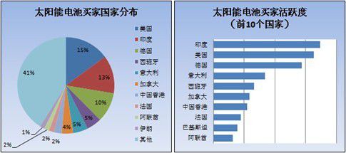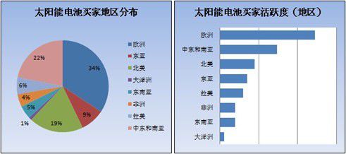 依据买家分布、活跃度以及询盘情况来看,环球市场的有效买家主要集中在欧洲(买家分布占比约为34%,询盘占比约为32.49%)、中东和南亚(买家分布占比约为22%,询盘占比约为21.94%)。从国家分布上看,美国、印度和欧洲地区的德国、西班牙、意大利等是环球市场的主要买家。根据对2008-2010年中国太阳能电池出口的分析,欧洲国家及美国市场是太阳能电池的消费大国,亚洲地区中国太阳能出口占有率较高,环球市场能为厂家提供进入这些太阳能电池主要出口国的有利渠道。