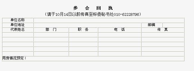 请各位参会代表务必将回执单填妥,并于2011年10月14日前传真至标委会秘书处,以便会务安排。