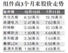 新增需求远赶不上产能扩张脚步的直接后果是,光伏组件及原材料价格均在近期大幅下跌。在此背景下,近3个月以来,中国光伏企业在美国股票市场全面下滑,不少股票更缩水达到六成以上,远超美国三大股指的同期跌幅。