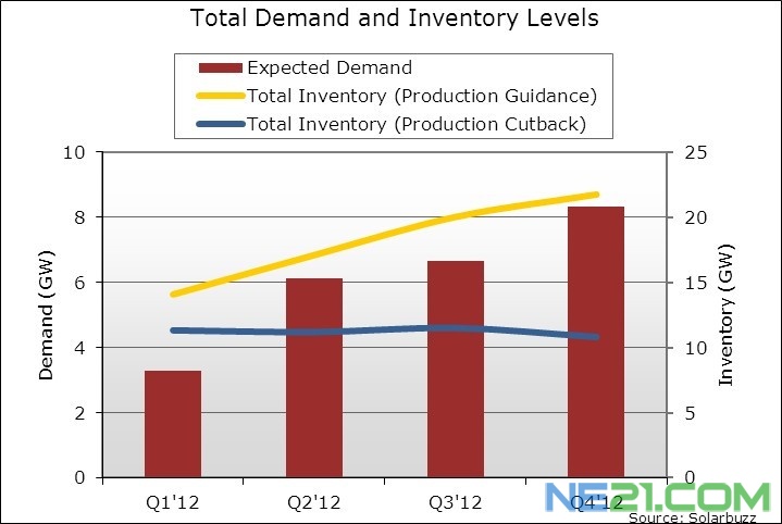 在产能过剩的情况下,如果不能有效控制产量,明年年底模组库存有可能飙升至22GW。为了使库存天数维持在与2011年底一样的水位,产量需要比厂商的计划减少约11GW。
