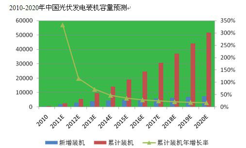 光伏发电具备良好的发展前景,未来中国光伏市场将维持较高增速。国家能源局正制定的新能源“十二五”发展规划中,将光伏装机目标上调至10GW,到2020年中国光伏装机目标可能大幅上调至50GW。目前的光伏上网电价预计在“十二五”期内可支撑2-5GW的年新增装机容量,预计2015年中国光伏累计装机容量达19.1GW,到2020年可实现51.6GW。“十二五”期间,光伏累计装机高速增长,期初年增速高达333%,期末年增速为35%,“十三五”期间,光伏累计装机年增速将维持在平均20%上下。中国将成为世界重要的光伏发电市场。