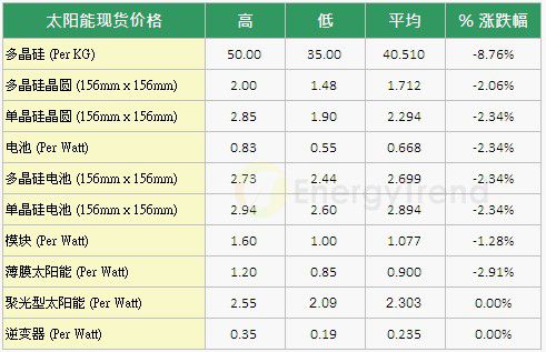而在模块方面,硅晶太阳能模块的平均价格下滑到$1.077/Watt,跌幅为1.28%;而受到硅晶模块的影响,薄膜太阳能的报价也出现下滑,目前平均价格来到$0.9/Watt,跌幅为2.91%。