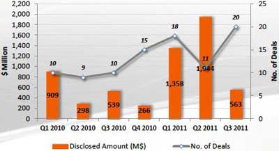 2011年第三季度出现20桩并购活动,交易总额达到5.63亿美元,其中披露细节的只有8桩。这是自2010年以来单季并购数量最大的一个季度,最著名的当属中国太阳能企业晶澳太阳能以1.80亿美元收购SolarSiliconValley以及MEMC以1.31亿美元收购FotowatioRenewableVentures。