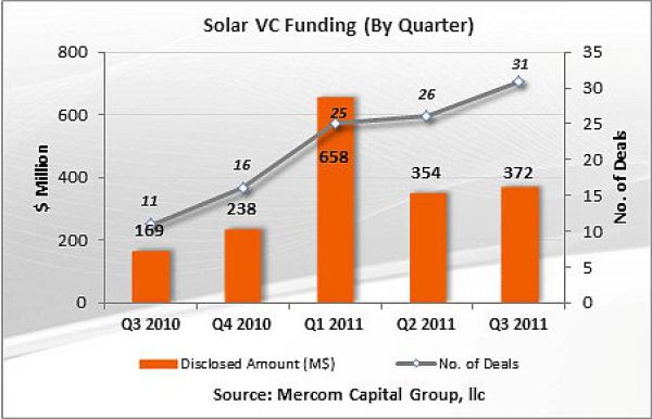 在光伏领域的风投资金已经达到3.72亿美元,2011第二季度为3.54亿美元。MercomCapital指出,共有42个不同的风投资金加入到29项交易中。