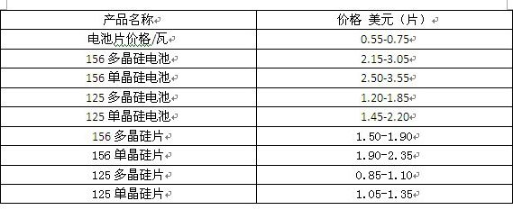 索比光伏网讯:根据今日国际光伏产品最新报价,125多晶硅电池跌至1.2美元/片,156单晶硅电池跌至2.5美元/片,125多晶硅片跌至0.85美元/片,156单晶硅片跌至1.90美元/片。