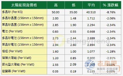 另外,由于第四季需求并未发酵,使得市场价格欲振乏力。本周现货报价部分,多晶矽、矽晶圆、与电池都同步呈现走跌的趋势。在多晶矽方面,目前成交价最低来到每公斤35美元,而平均价位下滑到每公斤40.51美元,跌幅为8.76%;而在矽晶圆部分,多晶的最低价格仍为每片1.48美元;而单晶的价格则下滑到每片1.9美元。