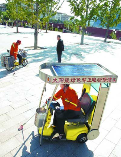 索比光伏网讯:17日,由西城环卫研制开发的三款28台太阳能绿色环卫电动保洁车上路试运行。该系列保洁车操作灵活又节能环保,实现了绿色保洁作业。