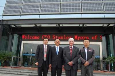 索比光伏网讯:近日,SEMI全球总裁兼首席执行官StanleyMyers在SEMI中国区总裁陆郝安陪同下前往常州,对晶体硅太阳能组件制造商天合光能进行参观考察,并与天合光能首席执行官高纪凡举行会谈,就目前光伏产业发展、光伏标准制定等话题进行了深入探讨。