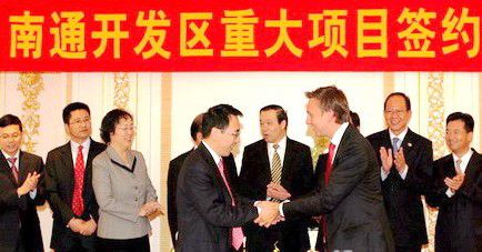 南通开发区管委会主任羌强与施韦策公司董事会主席马克先生在协议上签字。副市长沈振新、开发区党工委书记屈宝贤会见马克先生,并参加了签字仪式。图为签字现场。
