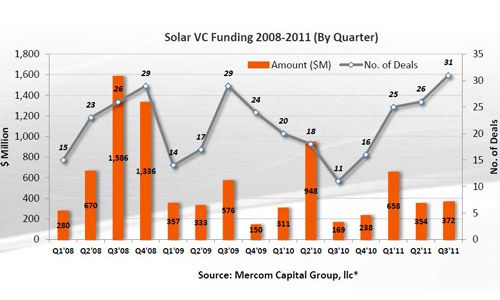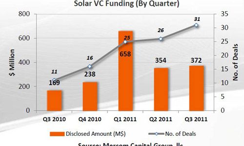 位于德克萨斯州奥斯汀市的清洁能源咨询机构马科姆资本集团(MercomCapitalGroup)发布2011年第三季度太阳能行业融资和并购活动报告。3季度进入太阳能行业的风投资本实现平稳增长,达到3.72亿美元,高于上季度的3.54亿美元。共有42个风险投资者参与了29桩交易。