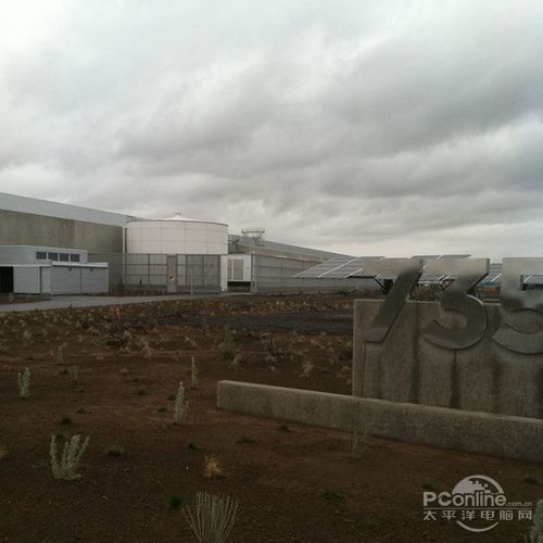 映入眼帘的是Facebook巨大的LOGO,环视四周发现Facebook数据中心利用密集布置的太阳能电池板收集太阳能。虽然是阴雨天但太阳能电池板依旧可以照常工作为数据中心储备电能。
