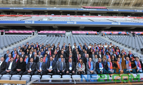 年会第一天下午在安联球场看比赛时,很多客户举起我们的围巾为拜仁呐喊加油,拜仁大胜柏林赫塔,客户们都非常激动!最令人激动的时刻当属比赛中场休息时我们的舞龙表演,巨大的带有英利标志的圆形旗帜出现在安联球场中央,周边LED显示屏上滚动“中国英利”的文字和标志,英利足球队员舞动着中国金龙围绕英利旗帜舞动。很多客户开始大喊:“英利,英利……!”