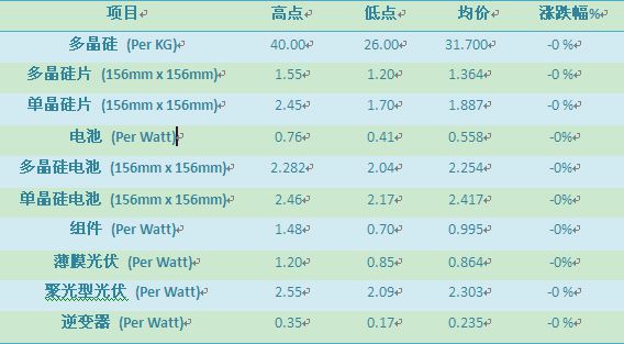 索比光伏网讯:今日光伏" title="光伏新闻专题">光伏产品现货报价(美元)基本没有明显的跌涨幅,多晶硅最高现货报价40美元/KG,最低26美元/KG;156mm多晶硅片最高1.55美元/片,最低1.20美元/片,同规格单晶硅片最高2.45美元/片,最低1.70美元;156mm/片;多晶硅光伏电池最高2.28美元,最低2.04美元,同规格单晶硅光伏电池最高2.46美元,最低2.17美元;光伏组件最高报价1.48美元,最低0.70美元;薄膜光伏电池最高报价1.20美元,最低0.85美元;聚光光伏最高报价2.55美元,最低2.09美元;光伏逆变器最高报价0.35美元,最低报价0.17美元。