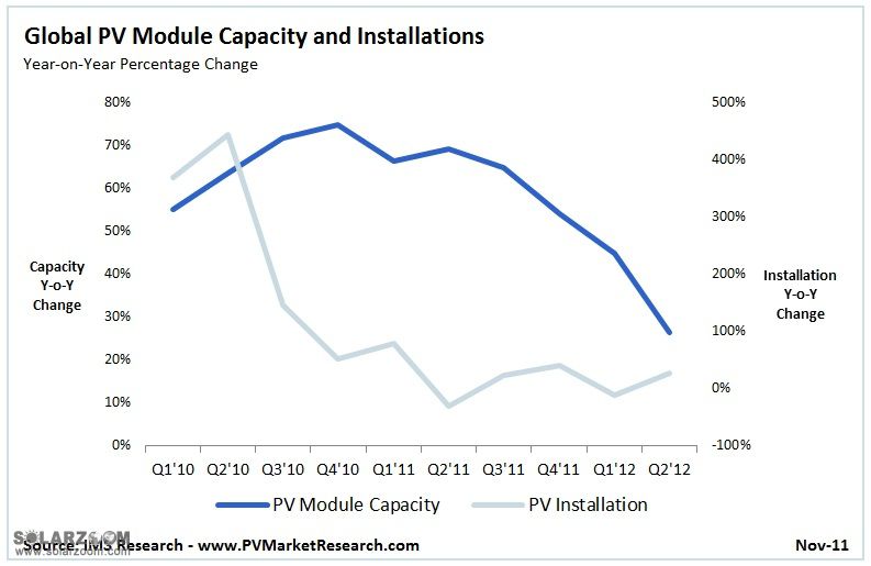 索比光伏网讯:据IMSResearch最新的季度报告显示,2011年年末及2012年上半年,光伏" title="光伏新闻专题">光伏组件、电池片及硅片产能将大幅放缓。过去两年,产能以惊人的速度增长,自2010年年初以来产能新增近30GW,该机构指出,随着多个主要地区的需求量减缓以及光伏产品的供应严重过剩,最终扩张步伐将有所趋缓。
