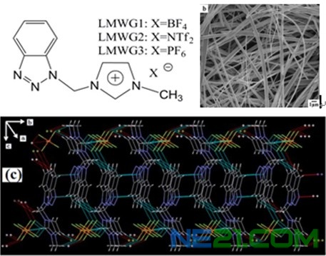 研究人员设计了一种含苯并三氮唑官能团的咪唑盐,将其加入普通咪唑盐离子液体中,其通过超分子组装形成高度有序纤维结构,而离子液体通过弱分子内相互作用(如氢键作用、π–π堆积、范德华力和静电相互作用)被俘获于纤维结构网络中形成离子凝胶。它可在机械剪切下液化,因此该离子凝胶在很宽的温度范围内都可作为摩擦副材料良好的润滑剂,具有较低的摩擦和良好的抗磨损性能;苯并三唑官能团赋予该咪唑盐优异的抗腐蚀与抗氧化性能,使得该离子凝胶有望作为无腐蚀固体电解质用于太阳能电池、超级电容器等。