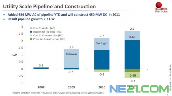 今年截止目前,该公司的项目管线新增了654MW合同,仅第三季度就达到了222MW。这包括同Tenaska签订的130MW总承包协议,同NRG签订的66MW总承包协议,同Constellation Energy签订的16MW总承包协议,以及同Verve Energy和GE Energy Financial Services在澳大利亚合作的首个公共事业级项目。管理层在会议上表示计划2011年在北美安装约450MW直流设备项目。