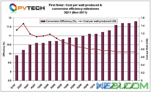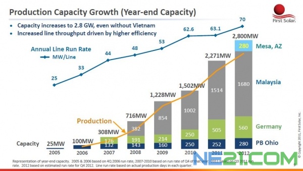 鉴于整个光伏供应链中的价格都受到供应过剩的影响,福斯第一将把注意力放在提高效率上。管理层在电话会议中强调,第三季度他们某些性能最好的生产线实现了12.4%的平均组件转换效率。Ahearn指出,该公司计划将单位成本进一步降至0.52至0.63美元之间,到2014年底将转换效率从13.5%提升到14.5%。管理层还强调了将焦点再次放到生产线的生产力上这一决定并预计平均生产线产量将从第三季度的每条生产线63.5MW提升到2012年年底的70MW。