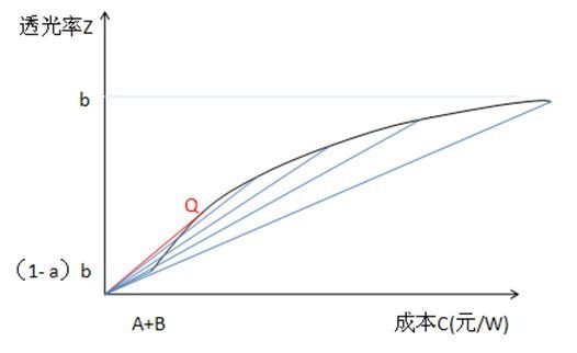 由图3可见,在Q点位置,经过原点的直线的斜率最大,即透光率/成本的值最大,性价比最佳。