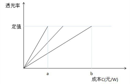 以透光率与成本(元/W)为坐标轴作图。