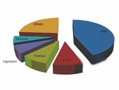 一个典型的太阳能发电系统由太阳能光伏" title="光伏新闻专题">光伏电池板阵列和逆变器组成。光伏电池板将太阳光线以直流电压的形式直接转化为电能;逆变器将光伏电池板产生的直流电压转换成可送至电网的交流电压。因此,逆变器已成为并网光伏系统的核心部件,其可靠性直接影响到整个光伏发电系统运行的稳定性。光伏逆变器按功率大小一般分为组串型和电站型两大类,其中,前者主要应用于住宅型屋顶和一些小型商业屋顶,后者主要应用于大型商业屋顶、工业厂房和大型地面光伏电站。全球光伏逆变器行业格局呈现出双寡头特点,以SMA、Powerone为主要两大供应商,Fronius、KACO、RefuElectronik等十多家企业位列其后,且份额基本接近,其中就包括合肥阳光电源。