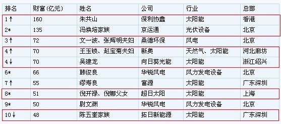 《2011胡润新能源富豪榜》上榜企业家共25位,光伏企业保利协鑫能源控股有限公司执行董事朱共山以160亿财富成为“2011年中国新能源首富”,光伏行业还有五人入选前十。