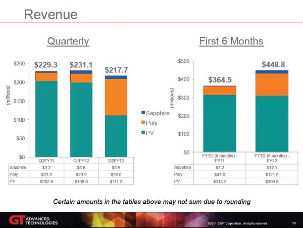 GTAT将年收入预期下调了5%,即5000万美元,2012财年收入预期现在为9.5亿至10.5美元之间。毛利润预期范围为43%到45%。2012财年上半年毛利润为2.085亿美元,收入的46.5%,上一财年毛利润则为1.39亿美元,收入的46.5%。
