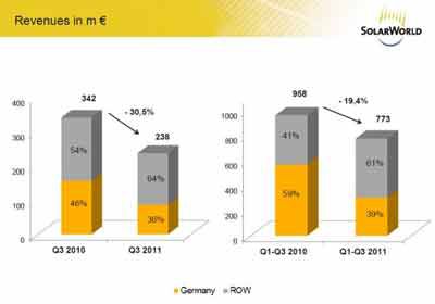 报告称SolarWorld前九个月出货量提高到576MW,与去年同期的568MW小有上升。收入为7.729亿欧元,相比去年同期的9.583亿欧元大幅下降。