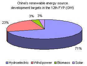 为了有效提高非化石燃料在能源的比例,“十二五”最初规划将投资4万亿人民币发展7个战略性新行业,可再生能源就位列其中。根据中国的可再生能源规划,“十二五”期间风电装机目标为90GW,水电装机为280GW,太阳能装机为10GW,生物能发电装机为1.3MW。